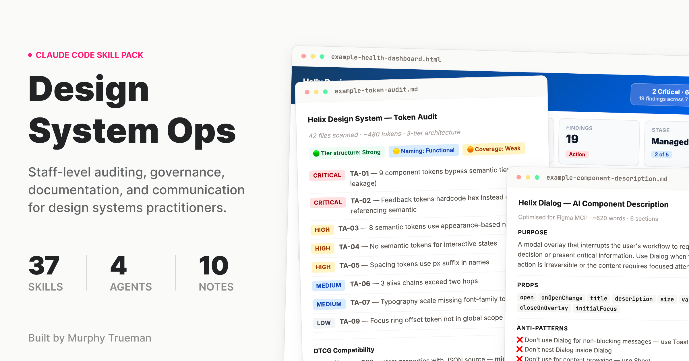 Design System Ops is a Claude Code skill pack. It teaches Claude how to do design systems work the way a staff-level practitioner would: with structured processes, expert frameworks, and output calibrated to the actual complexity of what you're dealing with.